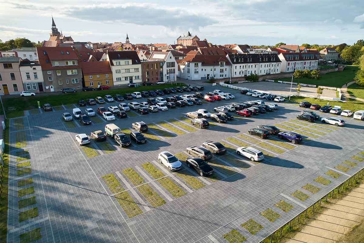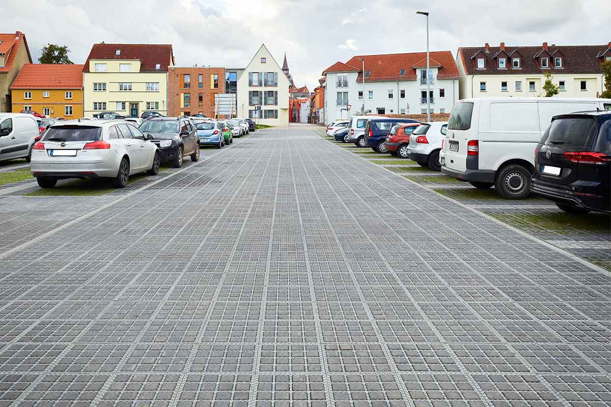 Der neue unversiegelte Park- und Festplatz der Stadt Güstrow kann flexibel genutzt werden. Durch den Einsatz verschiedener Farben des TTE® Pflasters wurden die einzelnen Parkplätze voneinander abgegrenzt.