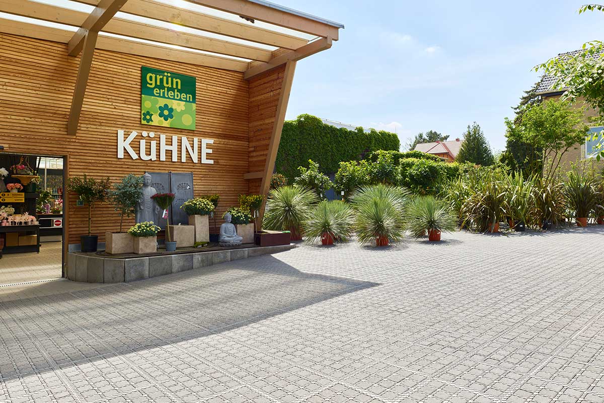 Das Gartencenter Kühne Grün erleben in Dresden heißt seine Kunden auf einem mehr als 2.000 m2 großen Kundenparkplatz willkommen. Gestaltet wurde er mit TTE® GRÜN und TTE® PFLASTER.