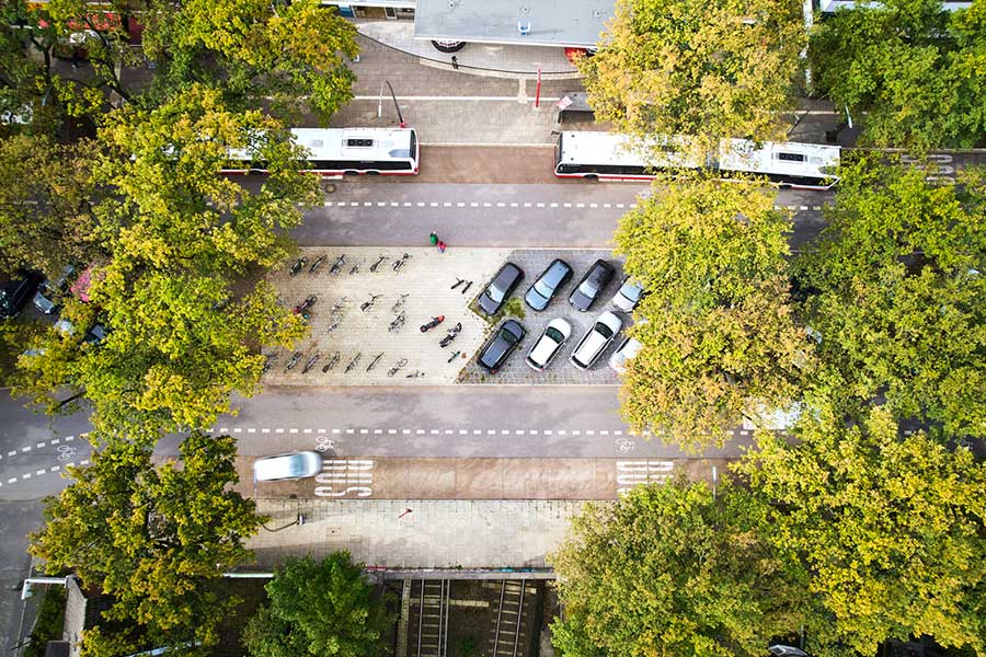 Die lastverteilenden Eigenschaften des TTE® Systems schützen die Wurzeln der Bestandsbäume vor Verdichtung. Darüber hinaus sorgt TTE® durch die unversiegelte Bauweise für eine gute Wasserversorgung des Baumes.
