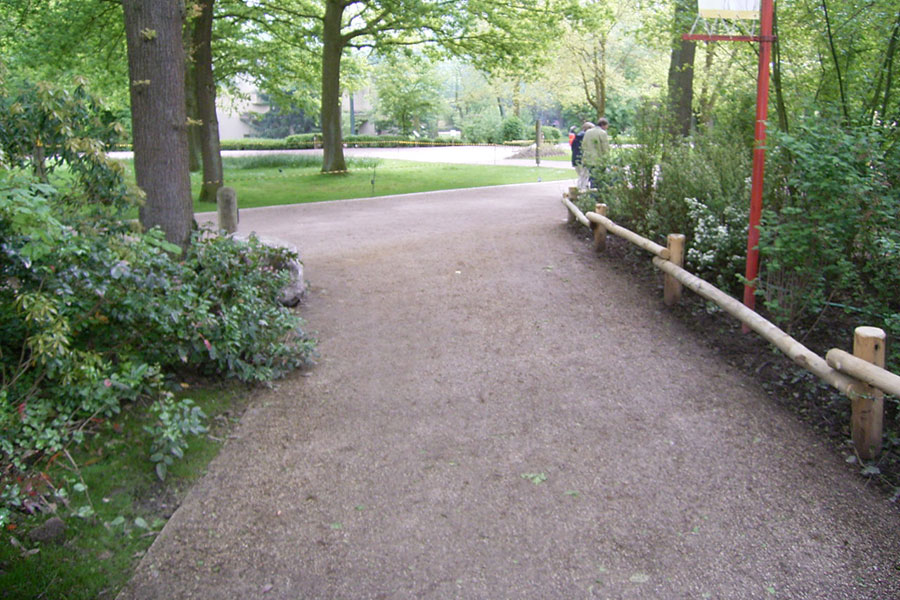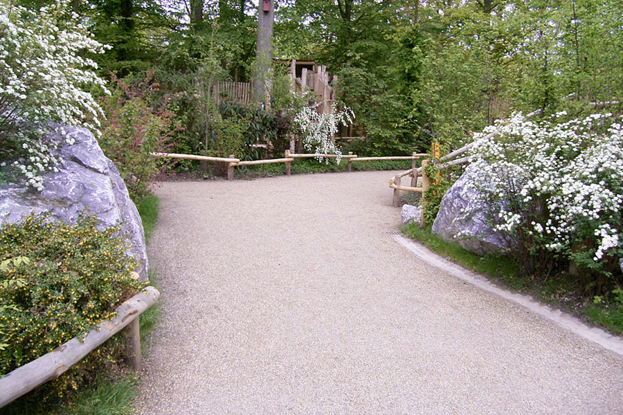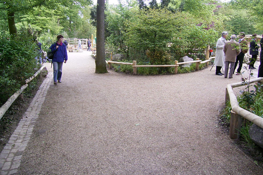 Im Zoo Münster können nun seit mehr als 18 Jahren Besucher auf einer wassergebundenen Wegedecke, mit dem TTE® System als Bewehrung, spazieren. Die Fläche ist seither wartungsfrei und ermöglicht auch das Befahren mit schweren Liefer- und Transportfahrzeugen.