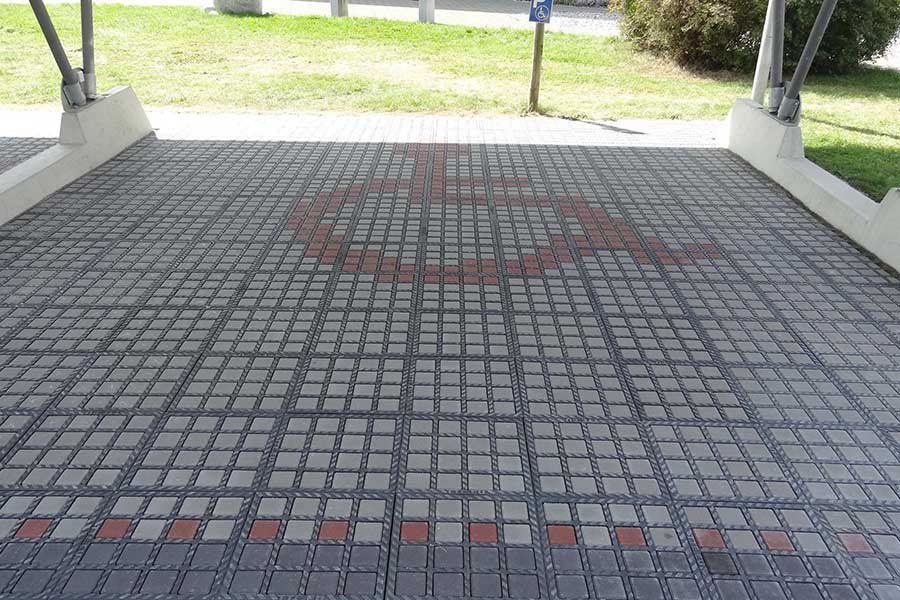Durch den Einsatz verschiedener Pflasterfarben wurde das Firmenwappen, ein Schmetterling, sowie verschiedene Piktogramme in den Parkplatz integriert.