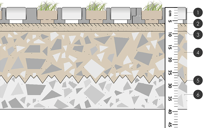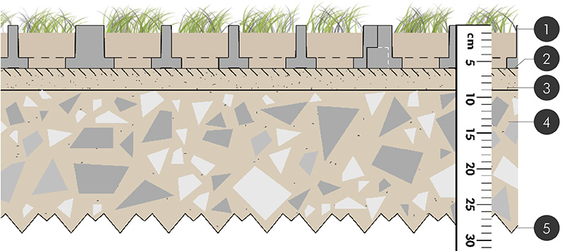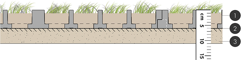 Die lastverteilende Eigenschaft der TTE® Rasengitter aus Kunststoff ermöglicht den Einsatz eines Substrataufbaus ­– auch unter dem Belag (insgesamt 25-30 cm). Bei herkömmlichen Rasengittersteinen oder Rasenwaben befindet sich das Substrat nur in den Kammern und Fugen. Diese vegetationsfähige Tragschicht aus Schotterrasen bildet einen erweiterten Wurzelraum und sorgt für eine außergewöhnlich hohe Wasserspeicherung und Nährstoffversorgung. Die massiven Stege mit mindestens 15 mm ragen über die Grasnarbe und schützen diese vor Druck- und Scherkräften.