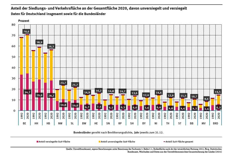 Im Jahr 2020 waren rund 44 % der Siedlungs- und Verkehrsflächen versiegelt. Betrachtet man die Gesamtfläche Deutschlands sind rund 21 % versiegelt. Das mag zunächst nach wenig klingen, betrachtet man aber vor allem die großen Städte, zeichnet sich ein anderes Bild. Im dichtbesiedelten Berlin sind etwa 70 % der Verkehrsflächen versiegelt.