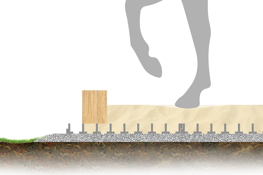 Dieser ermöglicht eine flächige Lastverteilung, wodurch Spring- und Dressurplätze aber auch Paddocks und Bewegungsflächen problemlos und ebenflächig ohne Unterbau gebaut werden können.