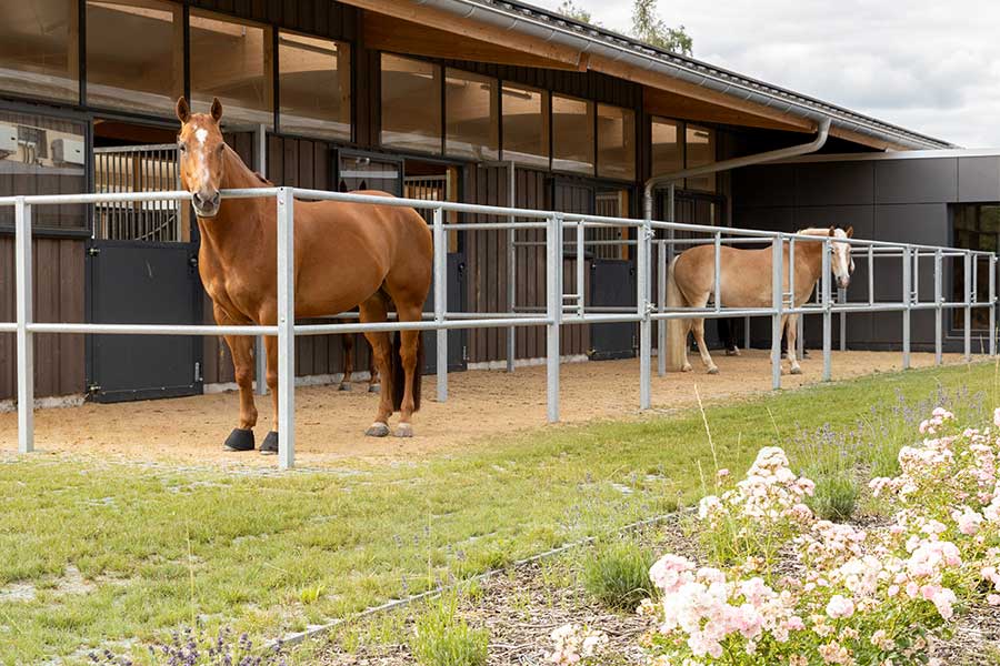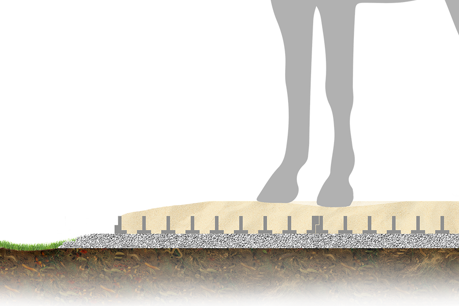 Dieser ermöglicht eine flächige Lastverteilung, wodurch Paddocks, Reitplätze und Bewegungsflächen problemlos und ebenflächig ohne Unterbau gebaut werden können.